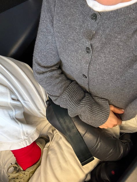Plane outfit: cardigan, non sweaty sweats (I use these for pilates too), old nikes