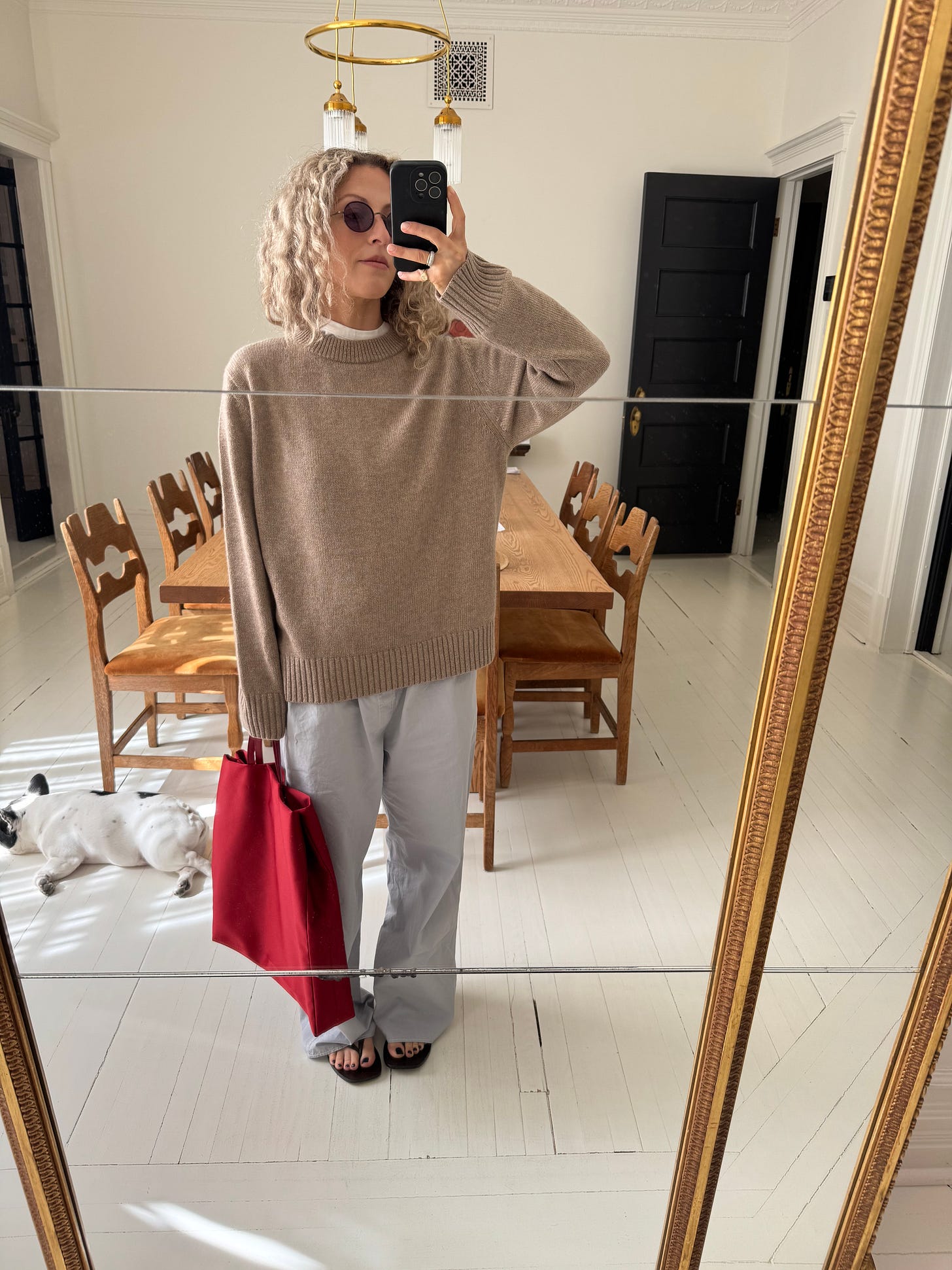 Since I’ve been back the weather has been all over the place. Nothing better to me than a knit and flip flops so here’s what I’ve been wearing. I really love the mix of cashmere and poplin pants. I like creating contrast with fabrics and colour combining of course.